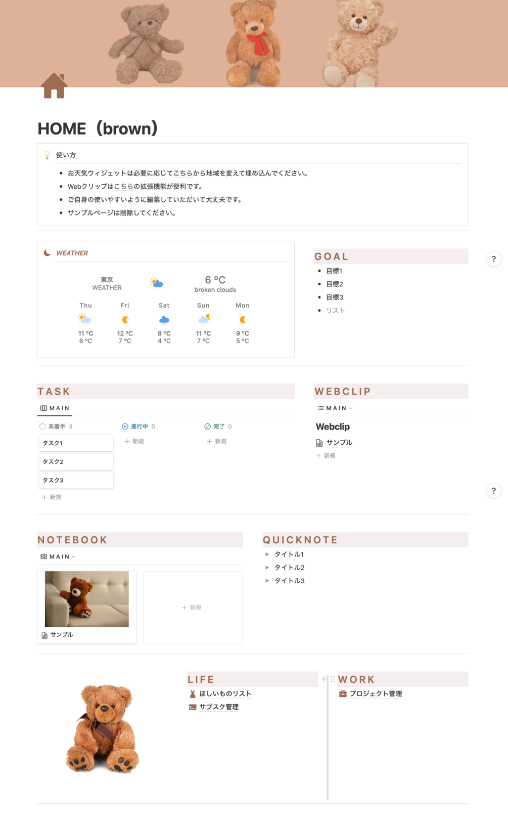 テディベアをイメージしたブラウン基調のNotionのHOME画面です。